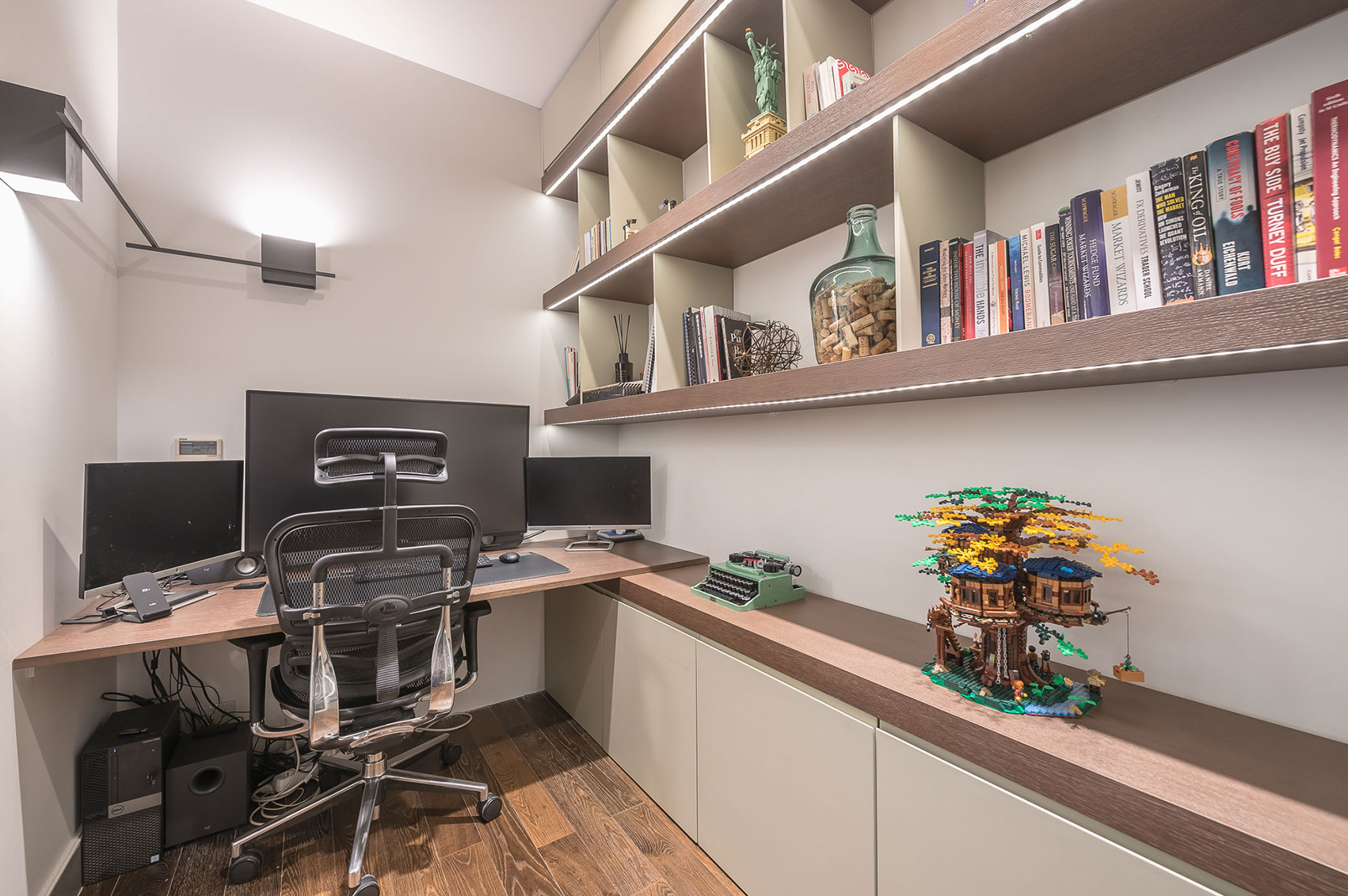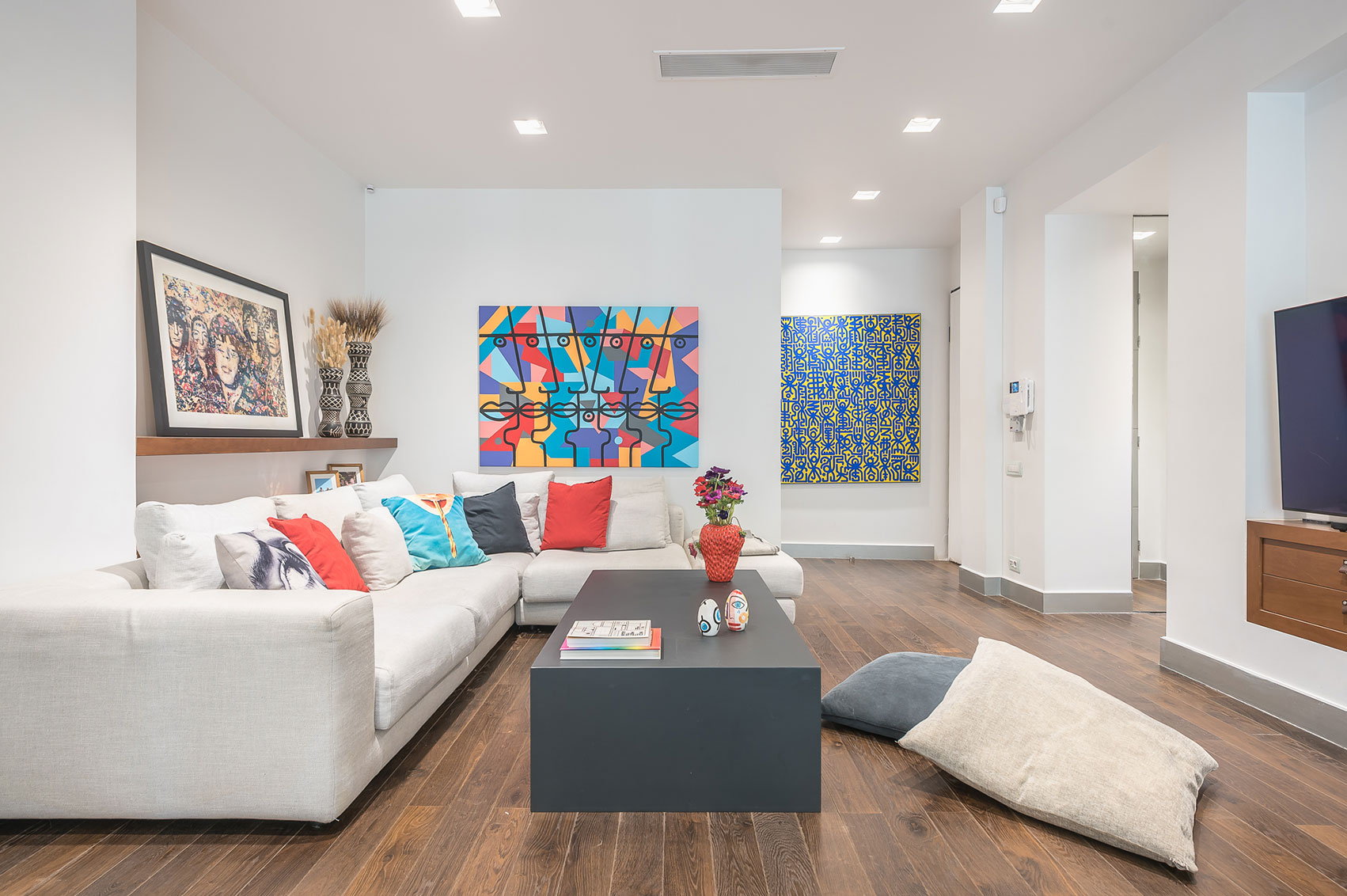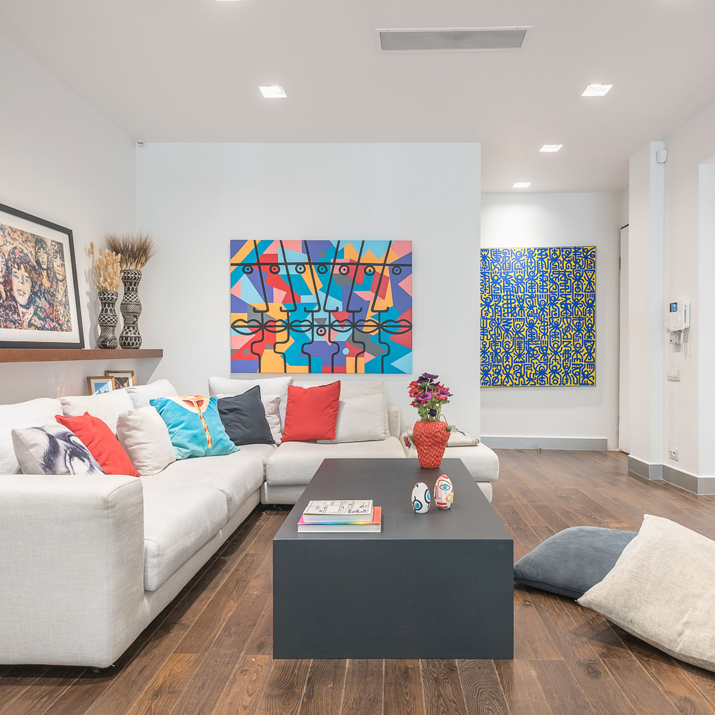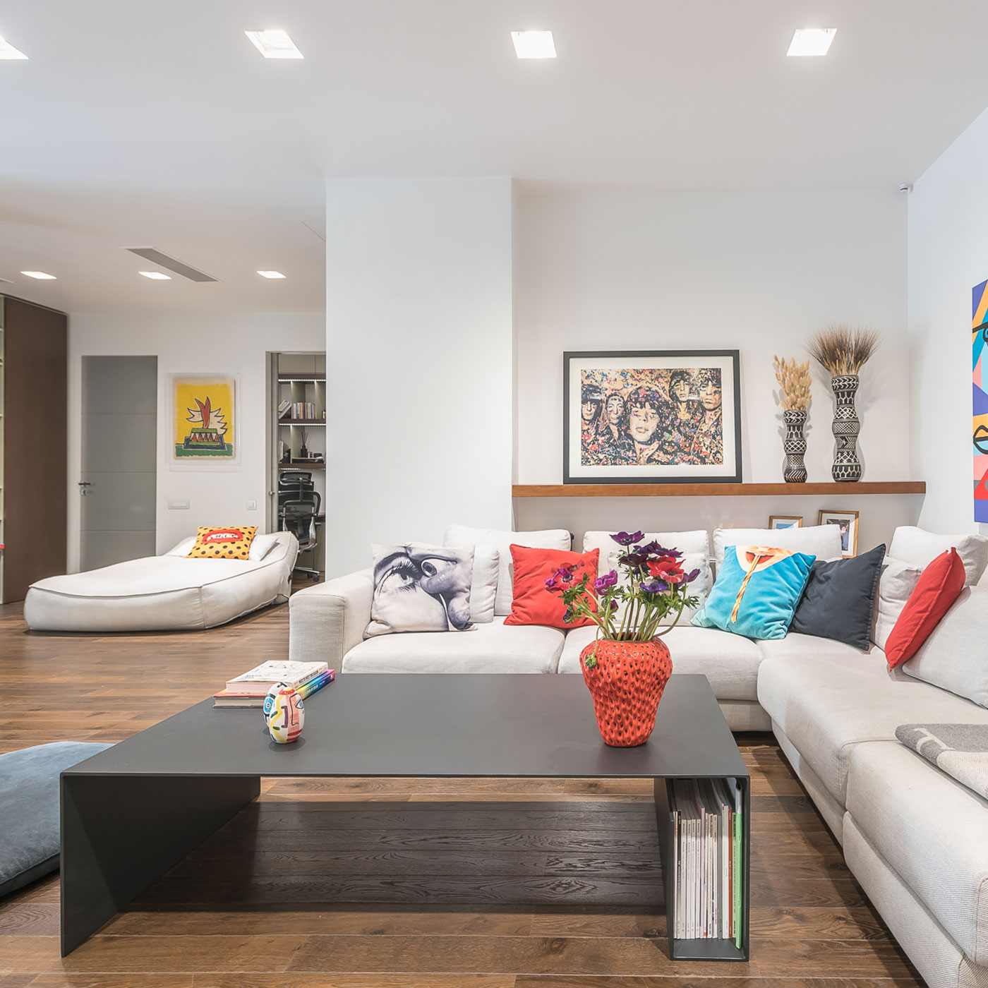 The design focused on the interior configuration of the living room, dining area, study, as well as the outdoor patio. All furniture was designed with the existing space in mind, and the new custom-made pieces harmonize both with the existing furnishings and with the pop-art elements already chosen by the owner.