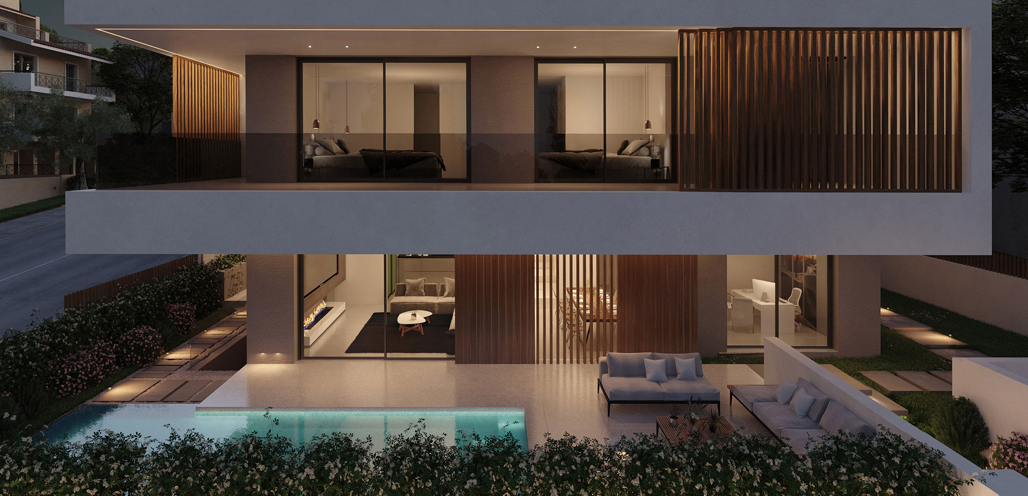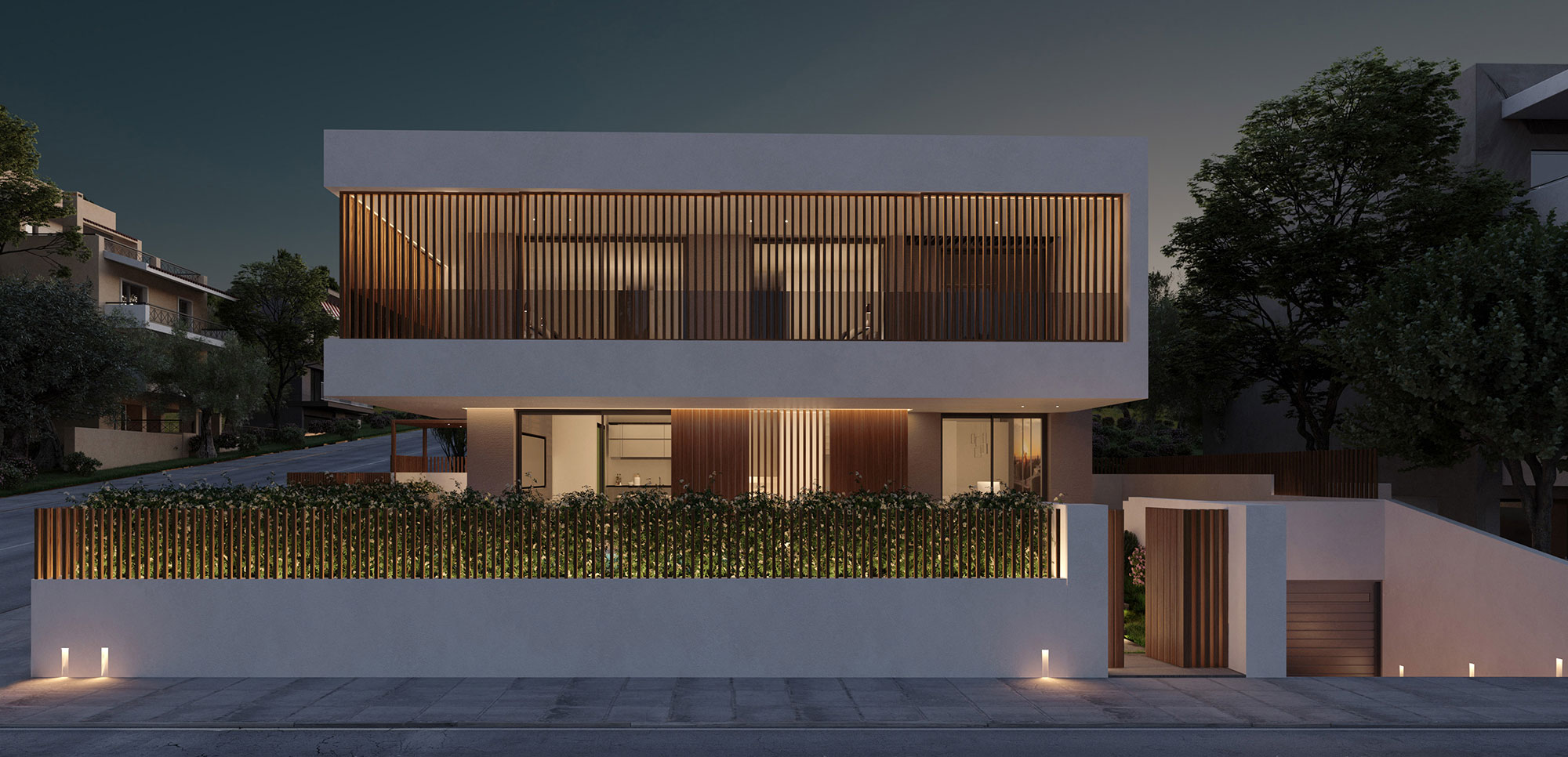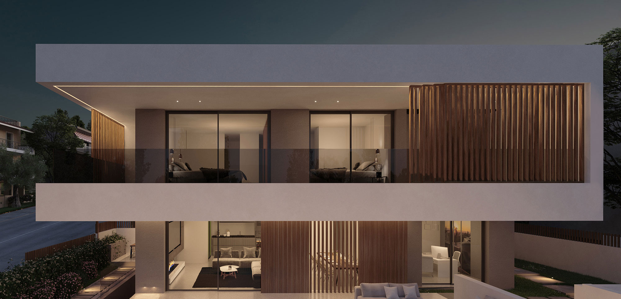 The choice of materials such as wood and cement in combination with the use of earthier shades on the surfaces of all spaces give the feeling of an imaginary continuity of the interior and exterior environment, achieving the complete harmonization of the building with the residential area of ​​Kantza.