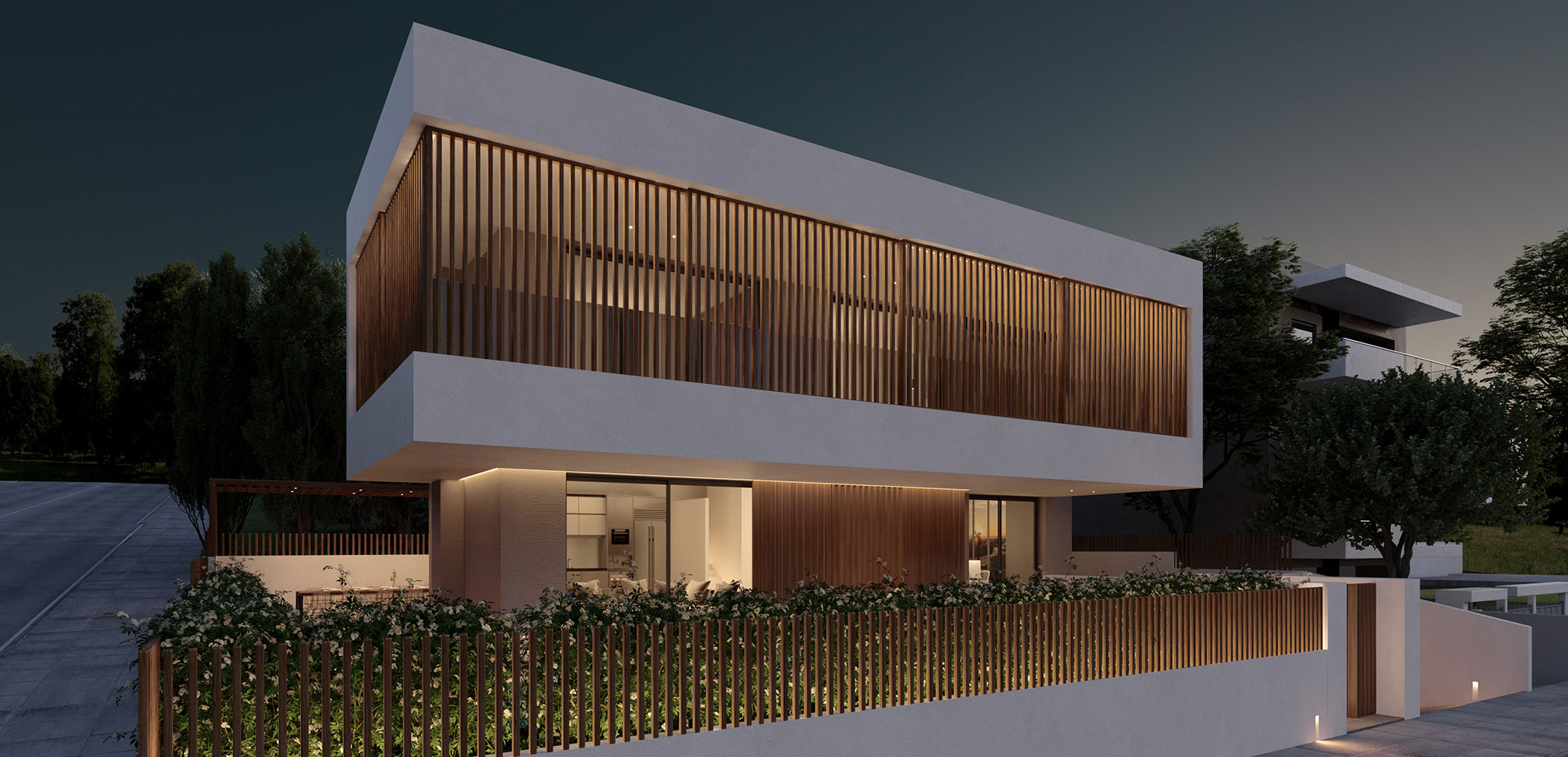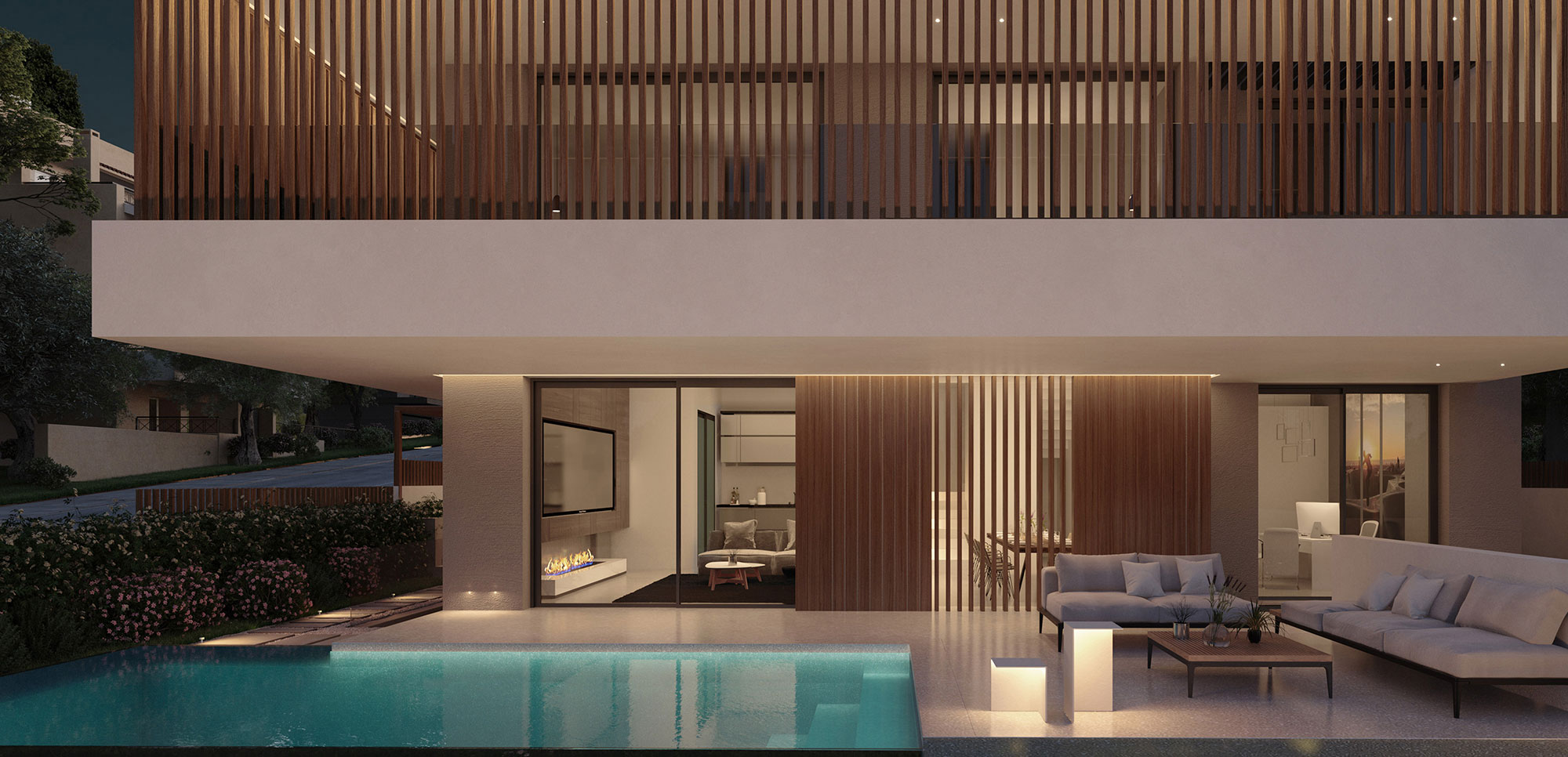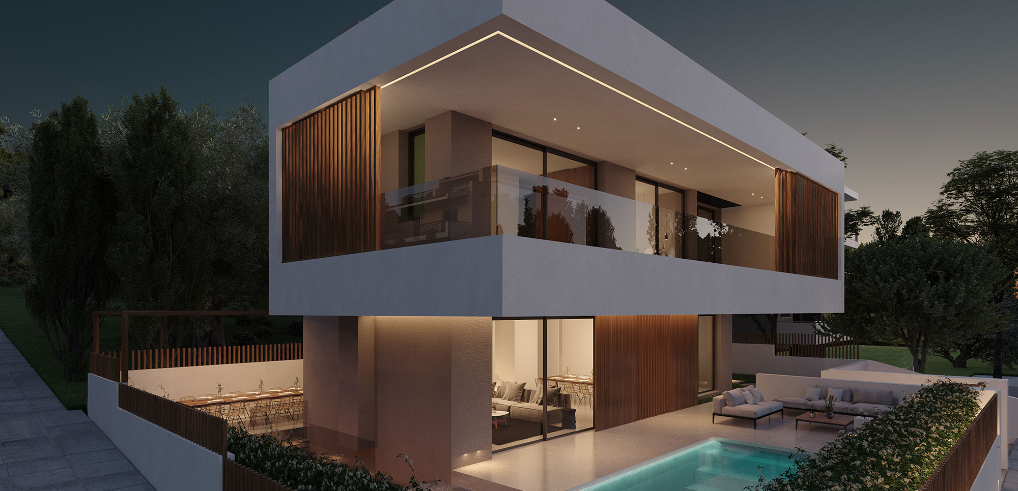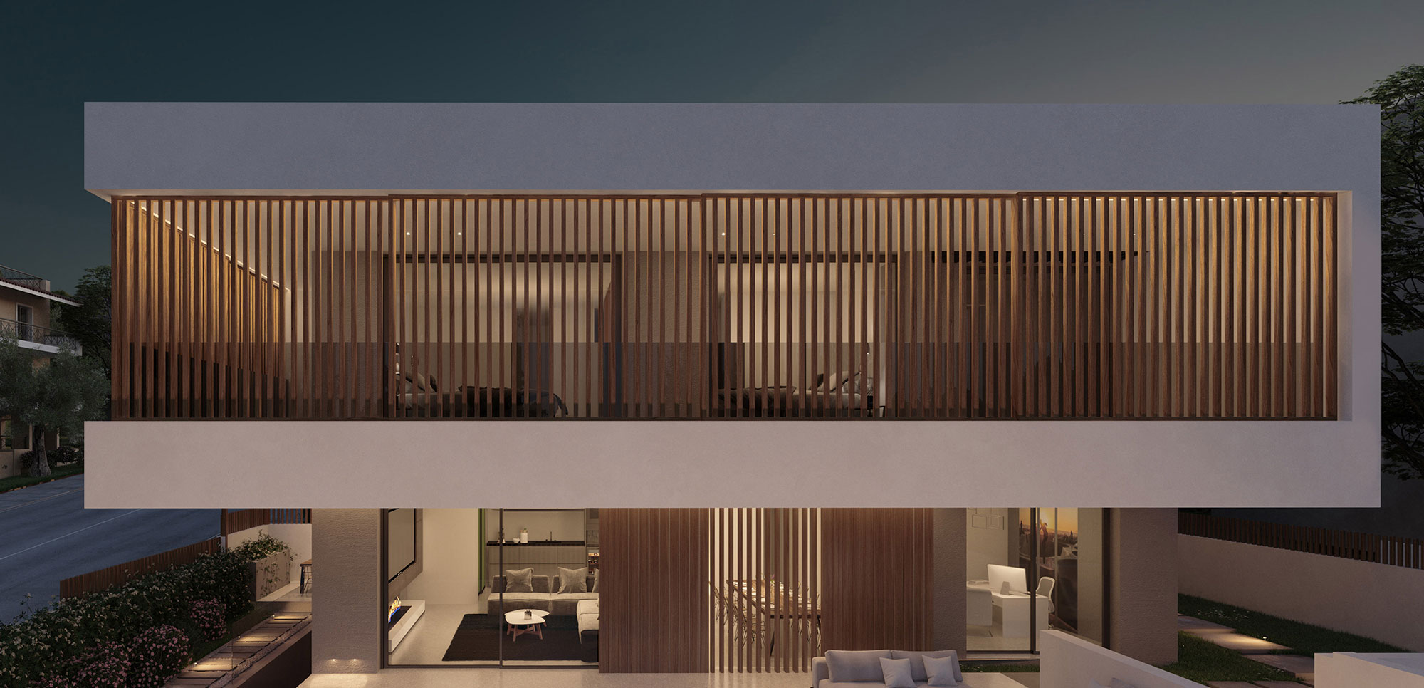 The choice of materials such as wood and cement in combination with the use of earthier shades on the surfaces of all spaces give the feeling of an imaginary continuity of the interior and exterior environment, achieving the complete harmonization of the building with the residential area of ​​Kantza.
