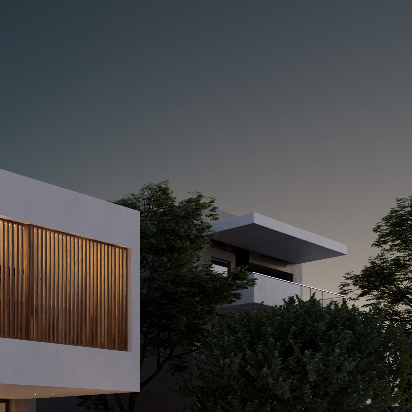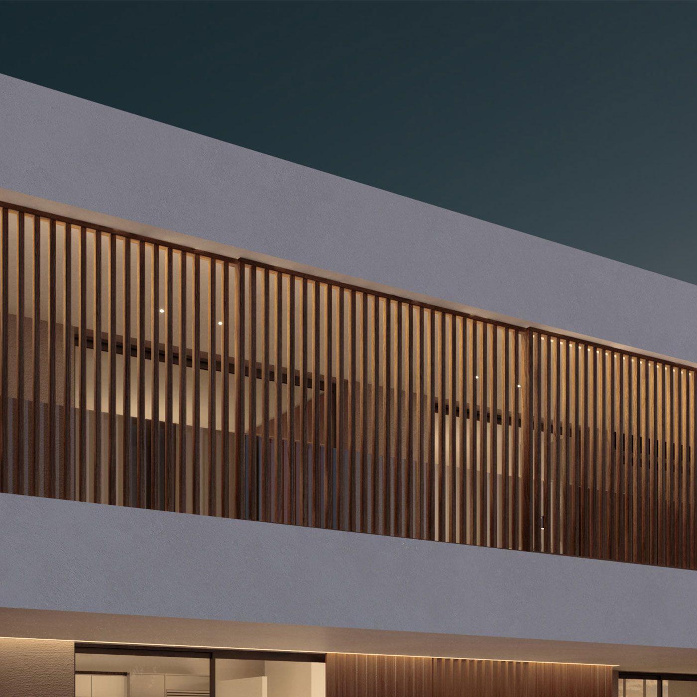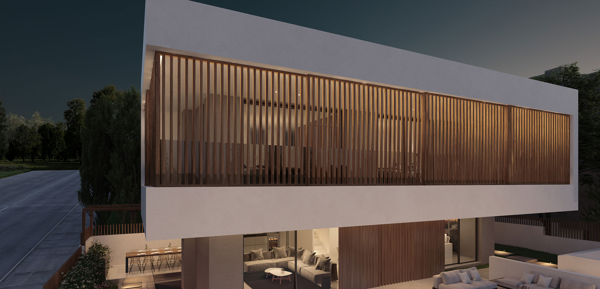 The house is divided into three levels including the basement. The ground floor mainly contains the common areas, while the first floor houses the private areas. Some secondary areas have been provided in the basement. Direct communication between the interior and exterior is achieved through large windows along the main facade of the house, fully utilizing the natural lighting and ventilation available on the site. The installation of sunshades on the front facade of the building aims to provide the best possible isolation and protection of the house, making them a characteristic element of the facade.