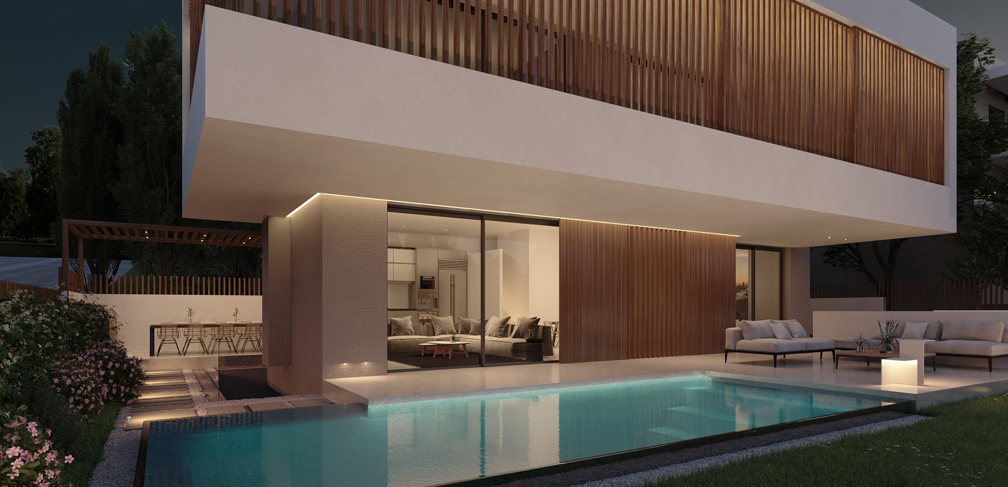 The aim was to create a new two-story house with a basement and an outdoor swimming pool in accordance with modern standards to meet the requirements of a family. The central idea was to create functional spaces that are distinguished by simplicity and symmetry.