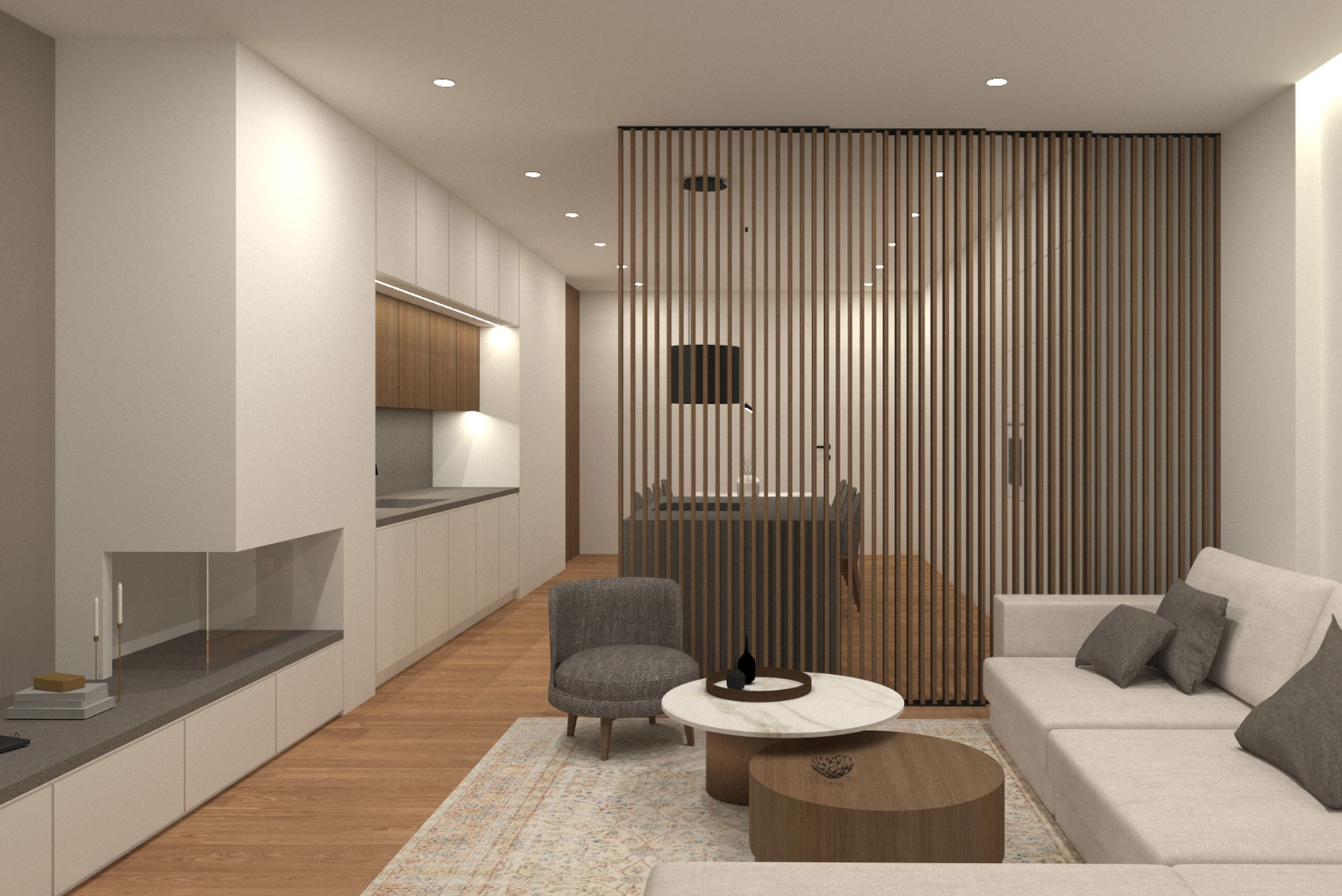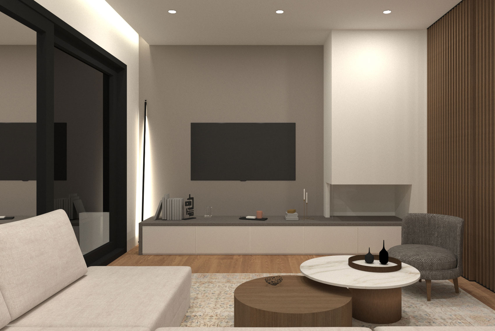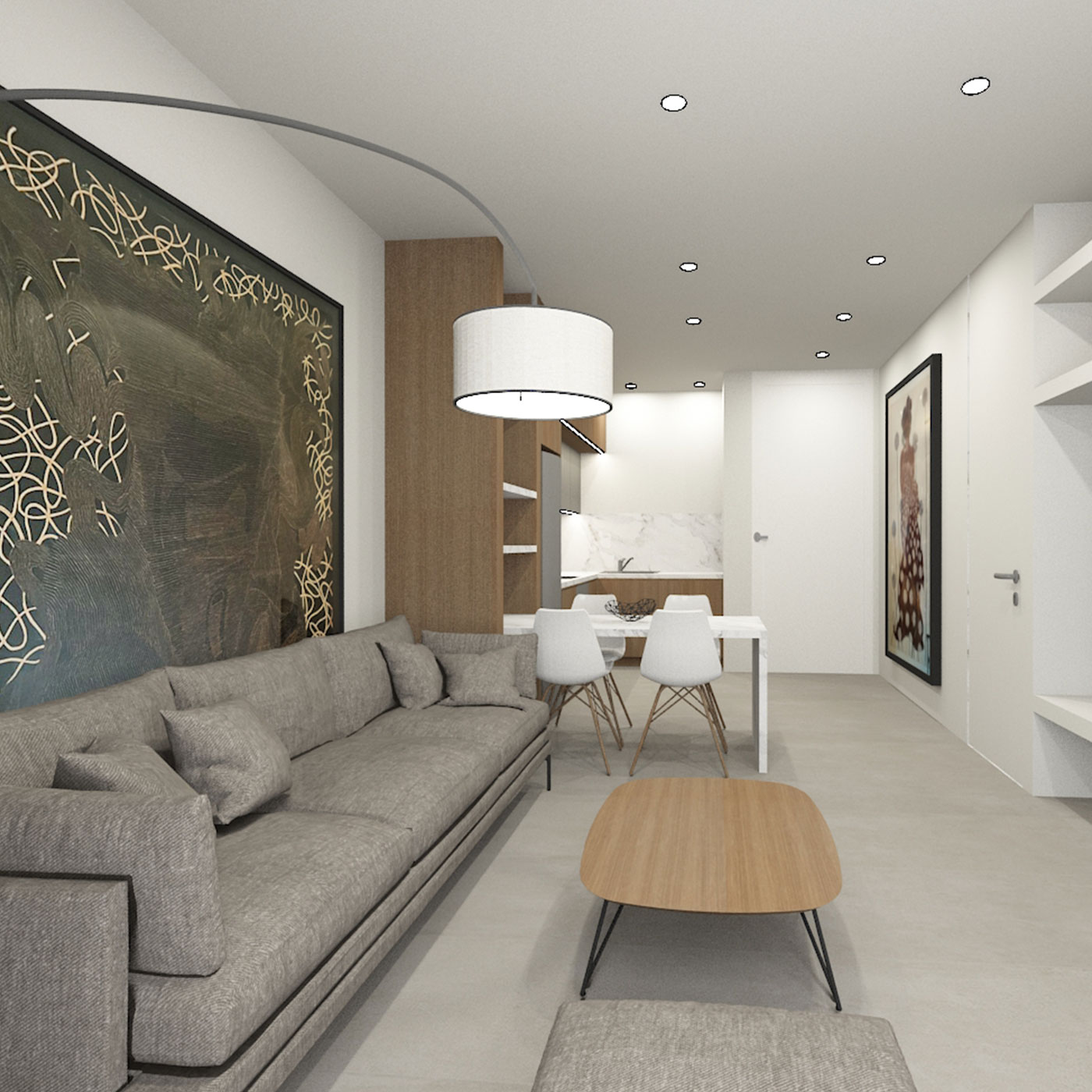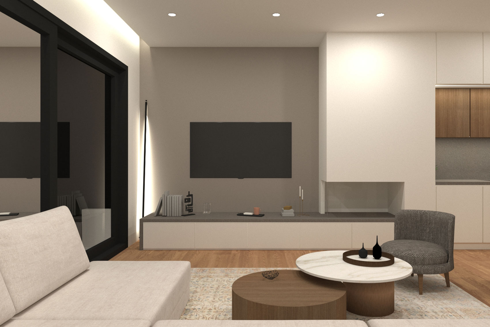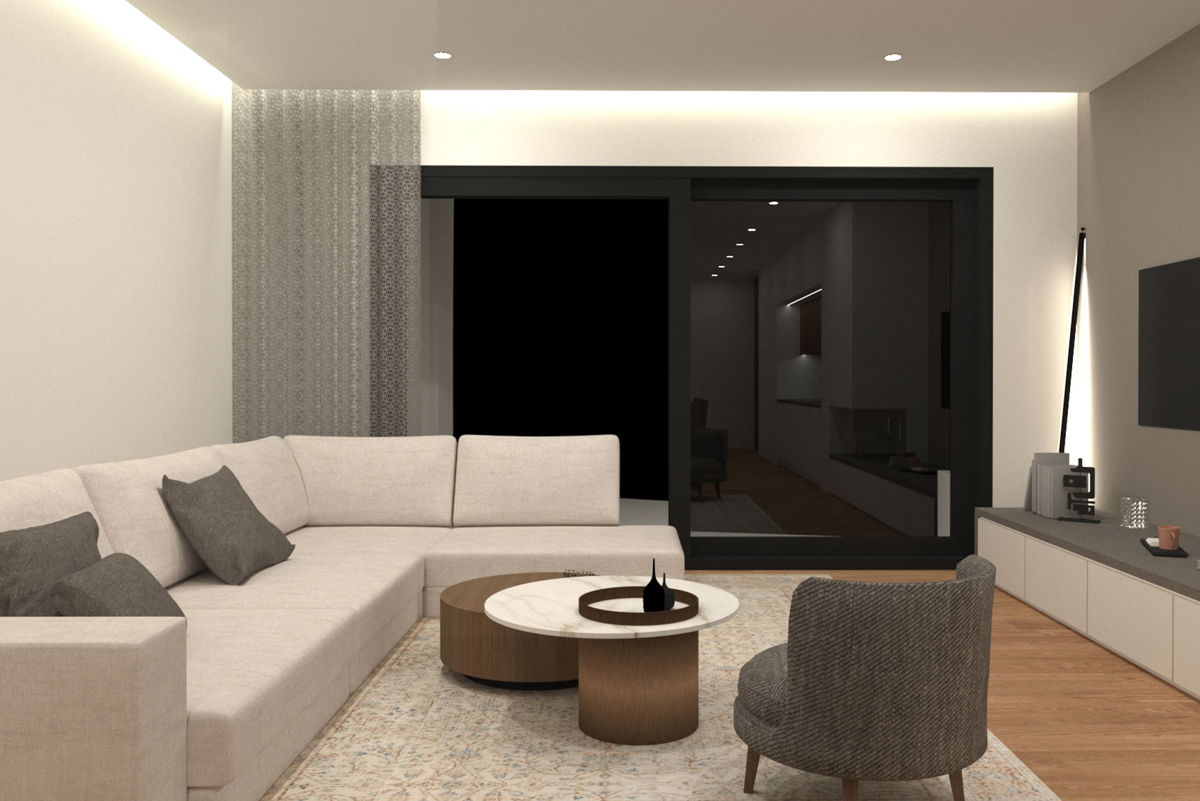 The objective of the project was the conversion of a single open-plan office space with a total area of 180 sq.m. into two separate apartments, one measuring 120 sq.m. and the other 60 sq.m. One apartment is designed to meet the needs of a four-member family, while the second is intended for rental use. Given the existing constraints—such as the existing structural system, the lack of plumbing infrastructure, and predetermined entrance locations—particular emphasis was placed on achieving the most efficient use of space. The subdivision of the interior areas was guided by the need to ensure freedom of movement, while balancing the integration of primary living spaces with the separation of private-use areas.
