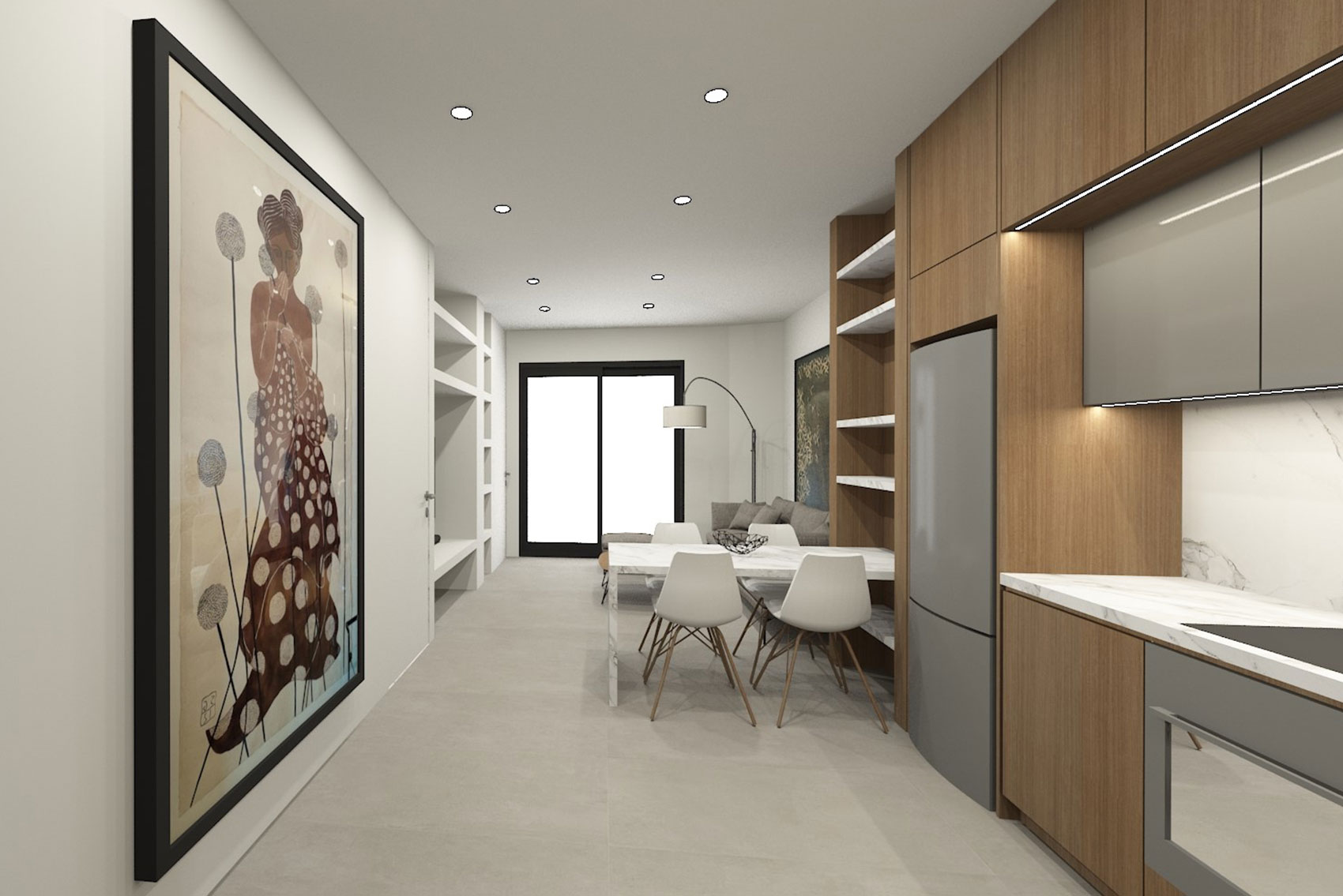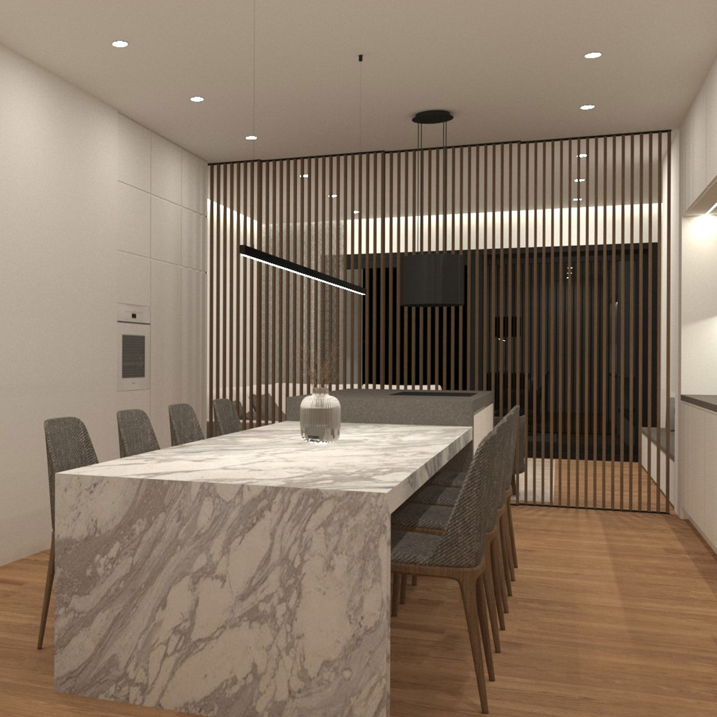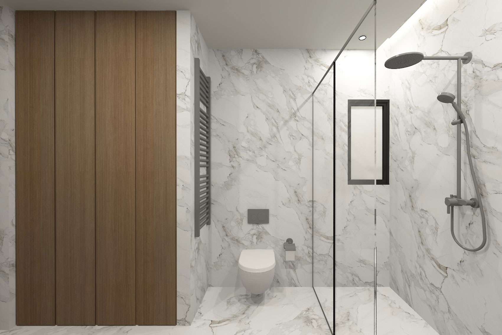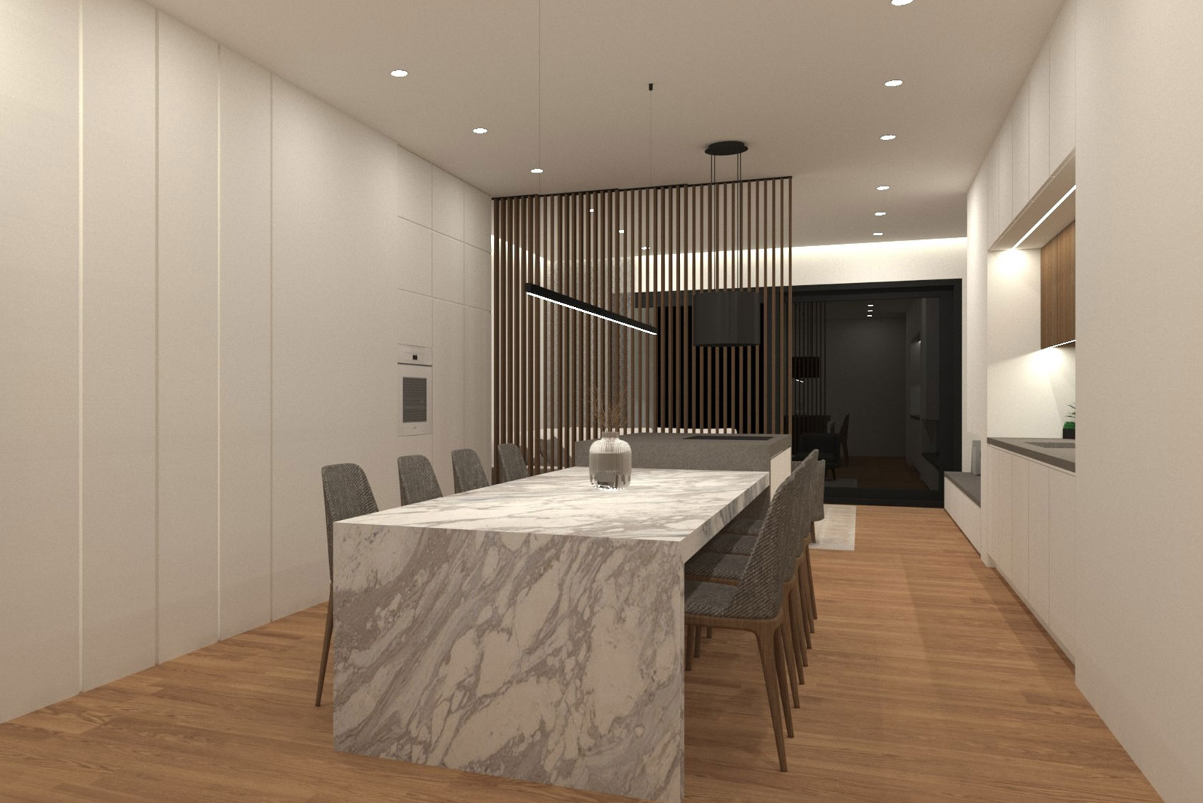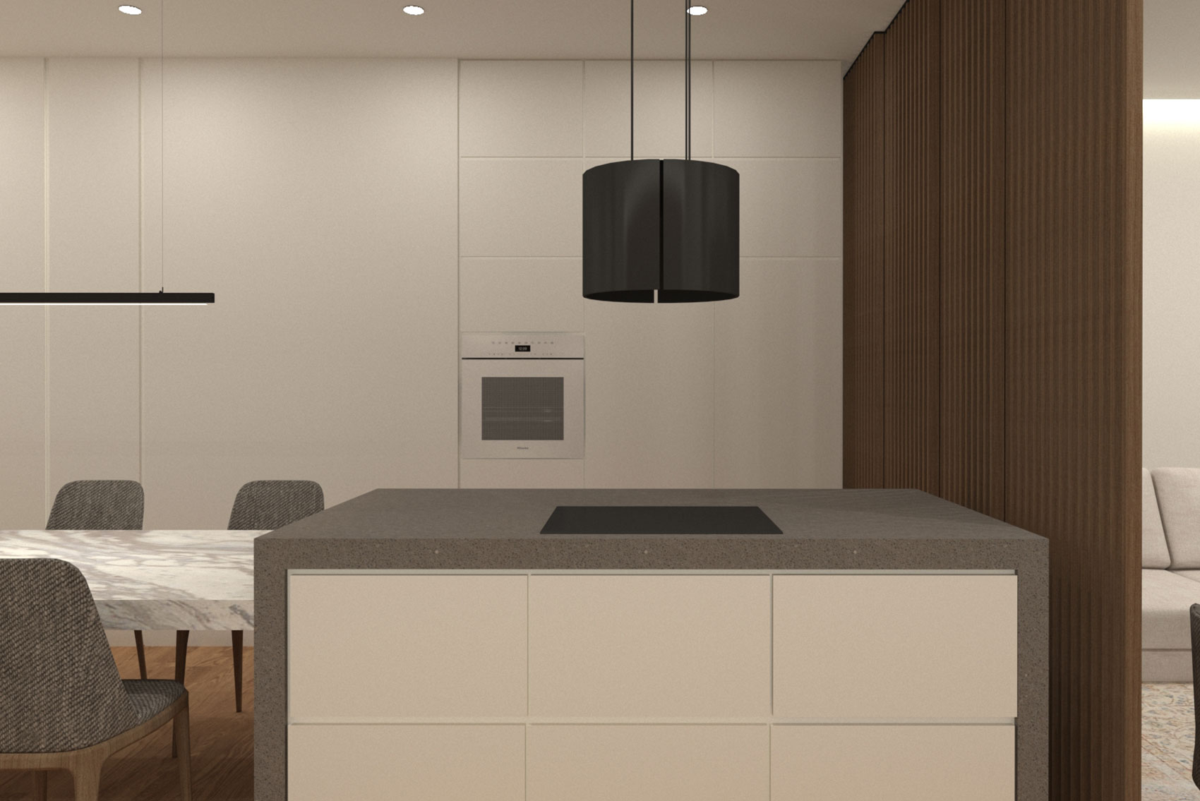 The objective of the project was the conversion of a single open-plan office space with a total area of 180 sq.m. into two separate apartments, one measuring 120 sq.m. and the other 60 sq.m. One apartment is designed to meet the needs of a four-member family, while the second is intended for rental use. Given the existing constraints—such as the existing structural system, the lack of plumbing infrastructure, and predetermined entrance locations—particular emphasis was placed on achieving the most efficient use of space. The subdivision of the interior areas was guided by the need to ensure freedom of movement, while balancing the integration of primary living spaces with the separation of private-use areas.