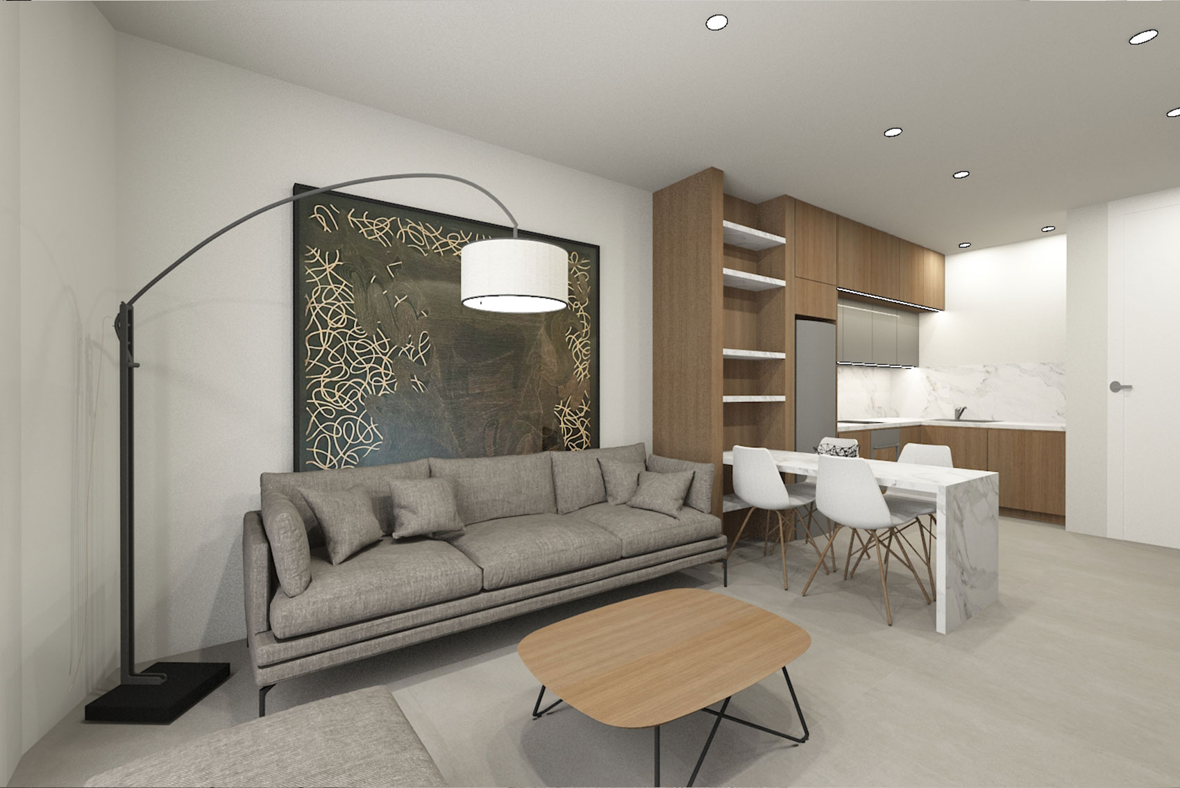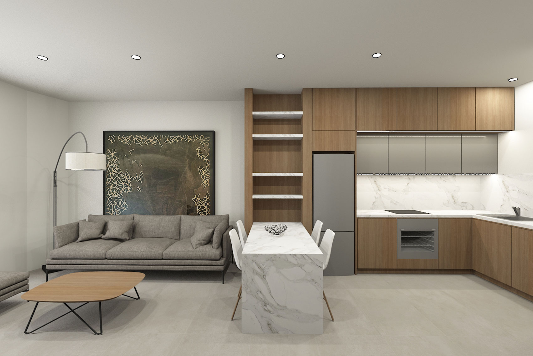 The second apartment follows a similar design strategy and comprises an open-plan kitchen–dining–living area, one bedroom, and one bathroom.