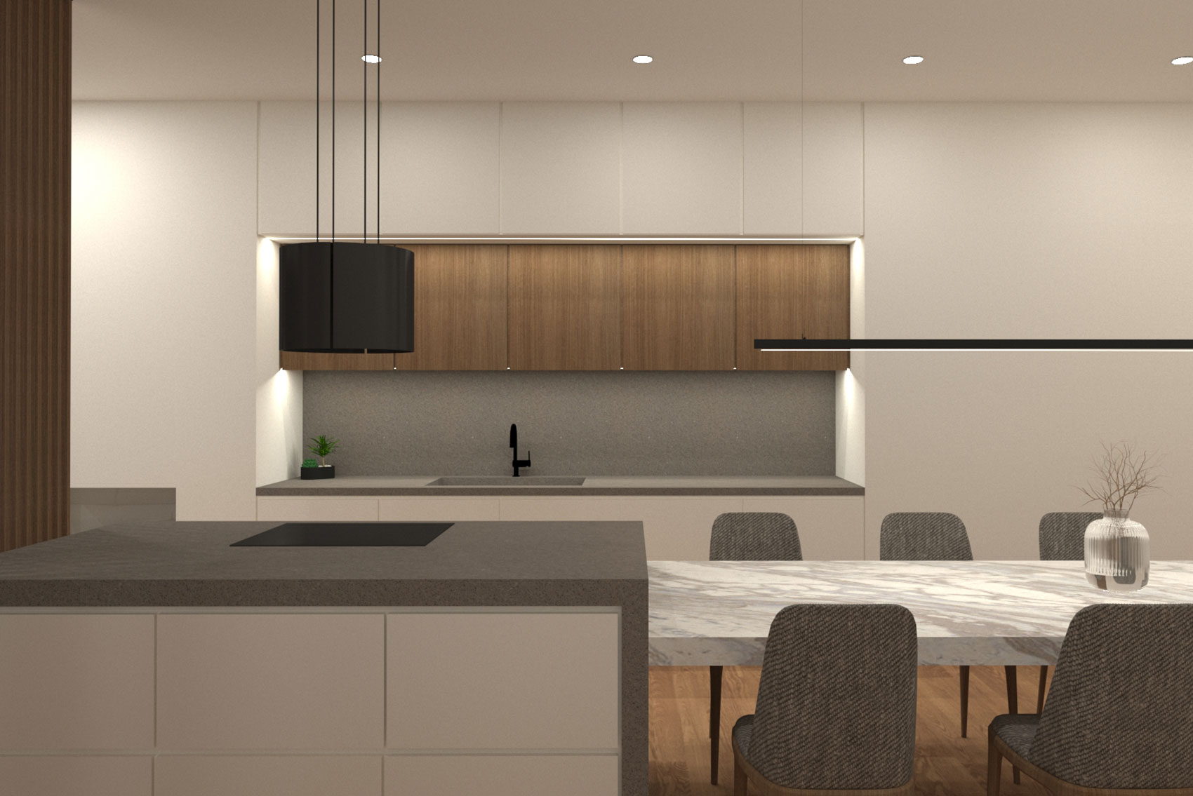 The use of materials such as wood, marble, and grey-toned elements gives the interiors a contemporary and minimalist character. The selection of light and bright finishes and textures enhances the diffusion of natural light throughout the spaces, contributing to the creation of a warm and welcoming living environment.